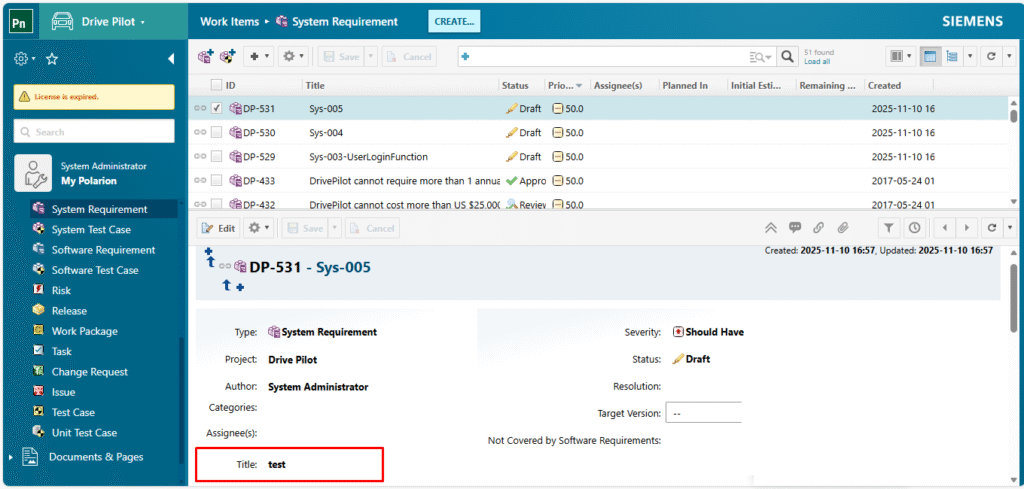 - Purpose: The Custom Work Item ID Generator automates the creation of standardized titles for specific work items (e.g., System Requirements) during item creation or modification. The script ensures consistent ID formatting by automatically assigning a sequentially incremented identifier with a defined prefix and optional descriptive suffix derived from a custom field. This automation improves traceability, reduces manual entry errors, and ensures uniform identification across the project.