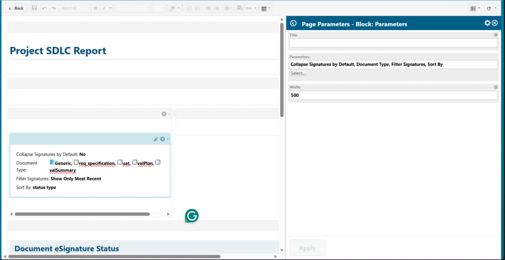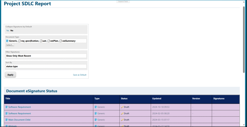 Purpose: The Project SDLC Customization provides a centralized overview of all documentation and electronic signature (eSignature) statuses across the software development lifecycle (SDLC). It helps project teams monitor the progress of document approvals, publication status, and compliance readiness within a project. The Customization is particularly useful during audits, design reviews, and validation stages to ensure traceability and document control.